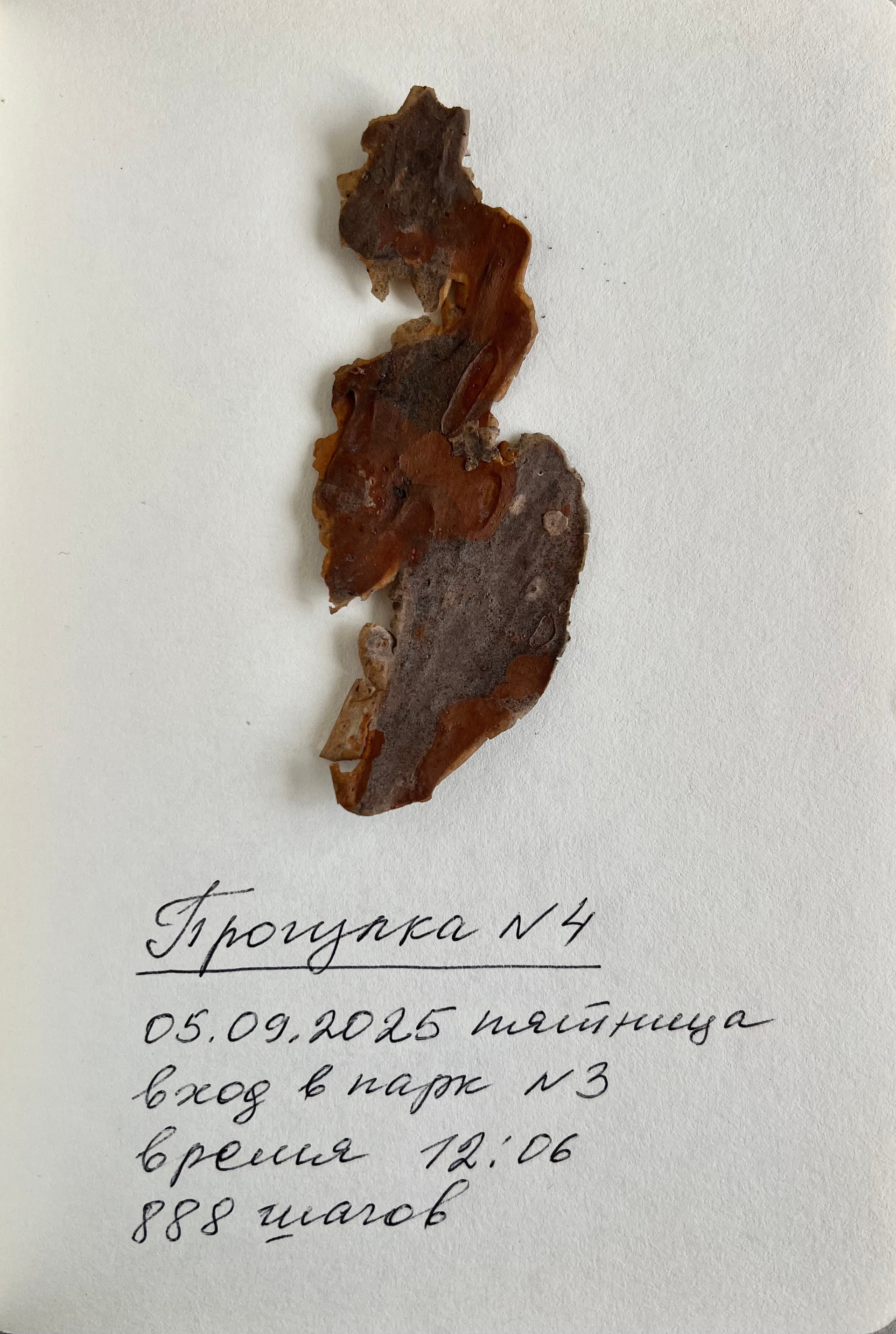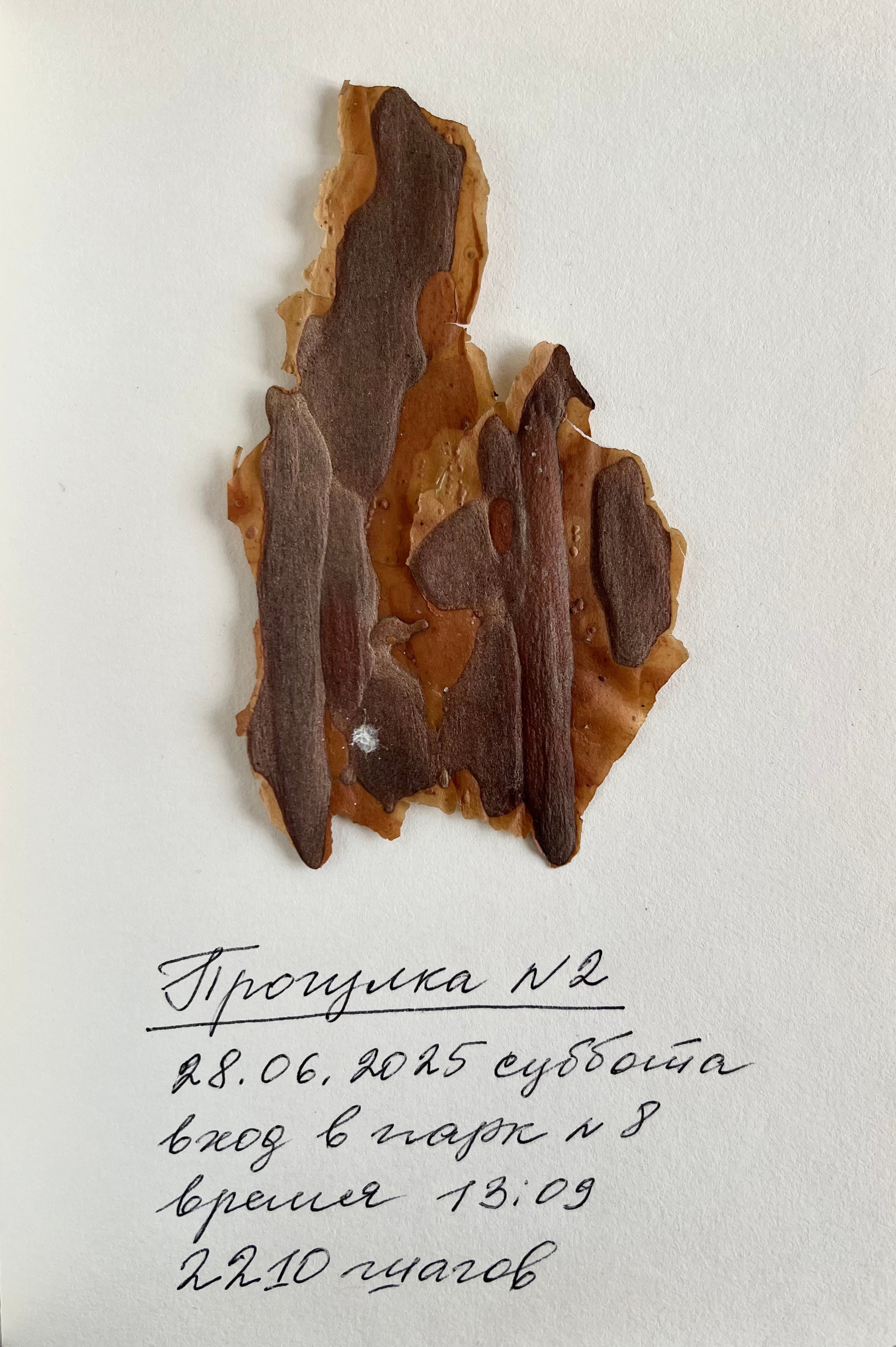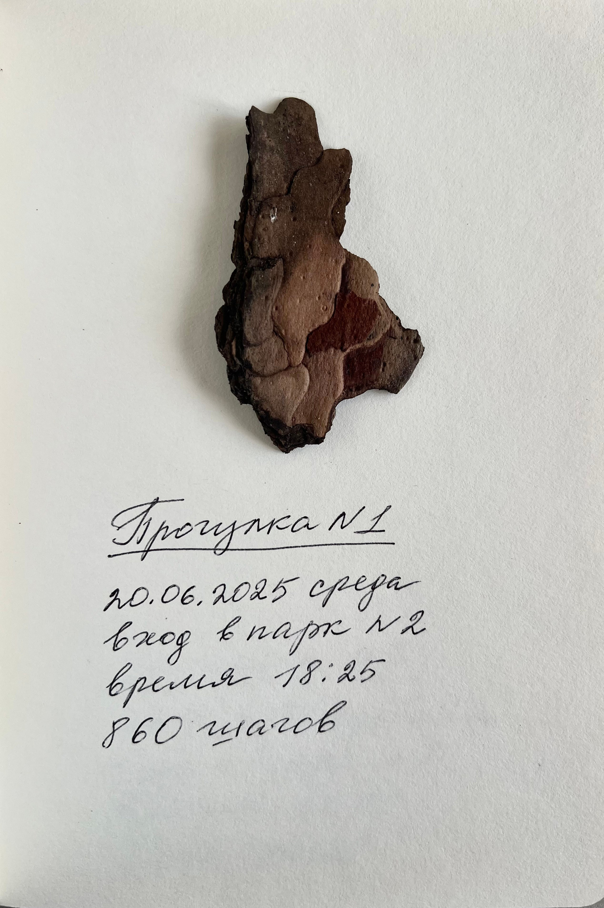 Я возвращаюсь в парк вновь и вновь, вхожу в него с разных сторон, фиксируя свои маршруты. Я считаю шаги, отмечаю изменения в собственном состоянии, фотографирую тени на белом листе бумаги и собираю опавшие фрагменты коры сосен. Эти простые действия становятся исследованием — личной археологией, попыткой восстановить связь с тем, что было спрятано и забыто.