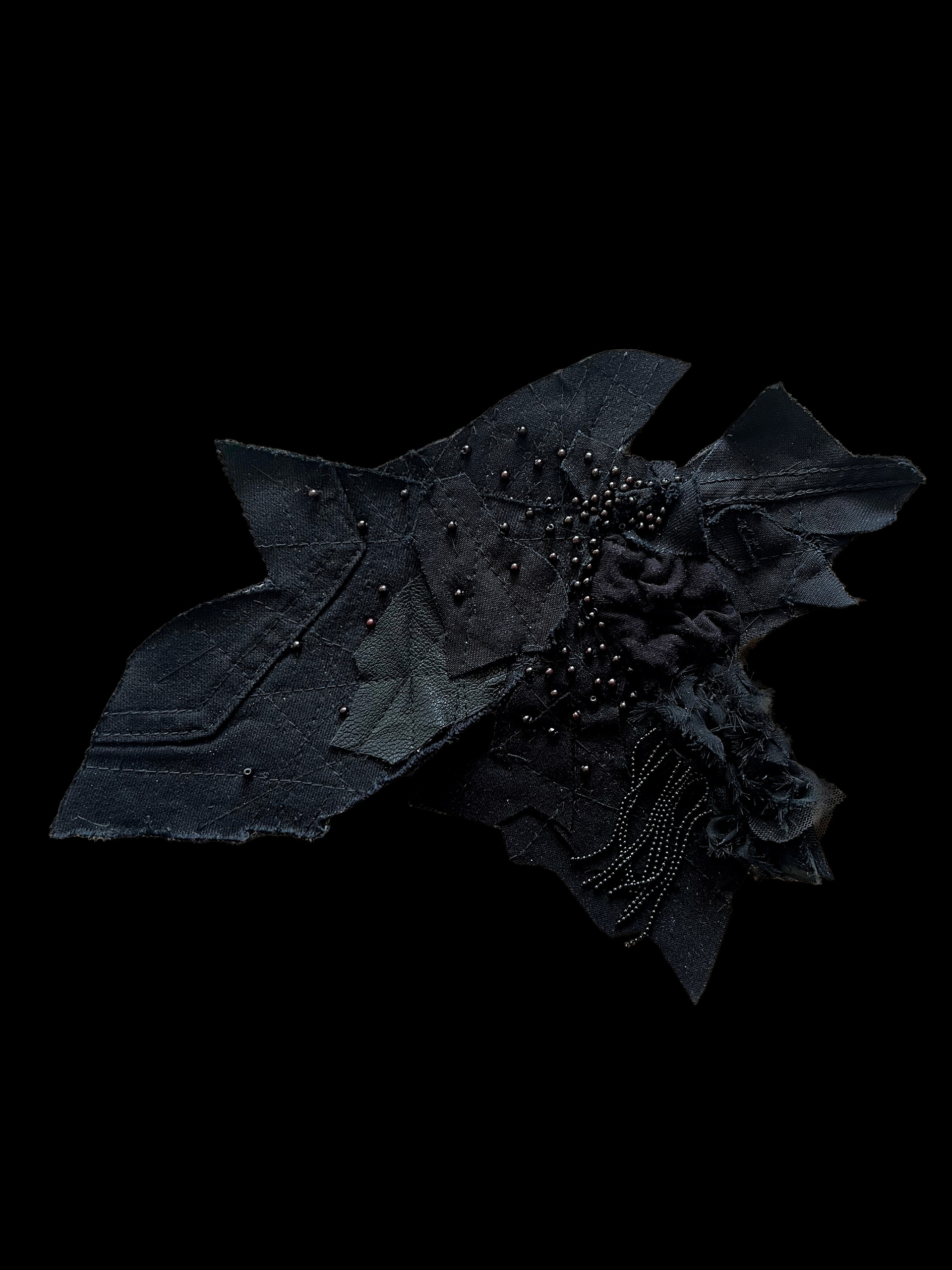 Собранные материалы обретают форму объектов: шаги превращаются в стежки, вышитые белыми нитками на черных лентах троп на моей карте из тканей, а силуэты теней — в черные текстильные объекты с яркой подкладкой, напоминающие татуировки или украшения. Я использую лоскутки от старой одежды, таким образом переосмысляя не только свою жизнь, но и вещи, которые когда-то были ее частью. Эти объекты воплощают архаическую часть моего сознания.