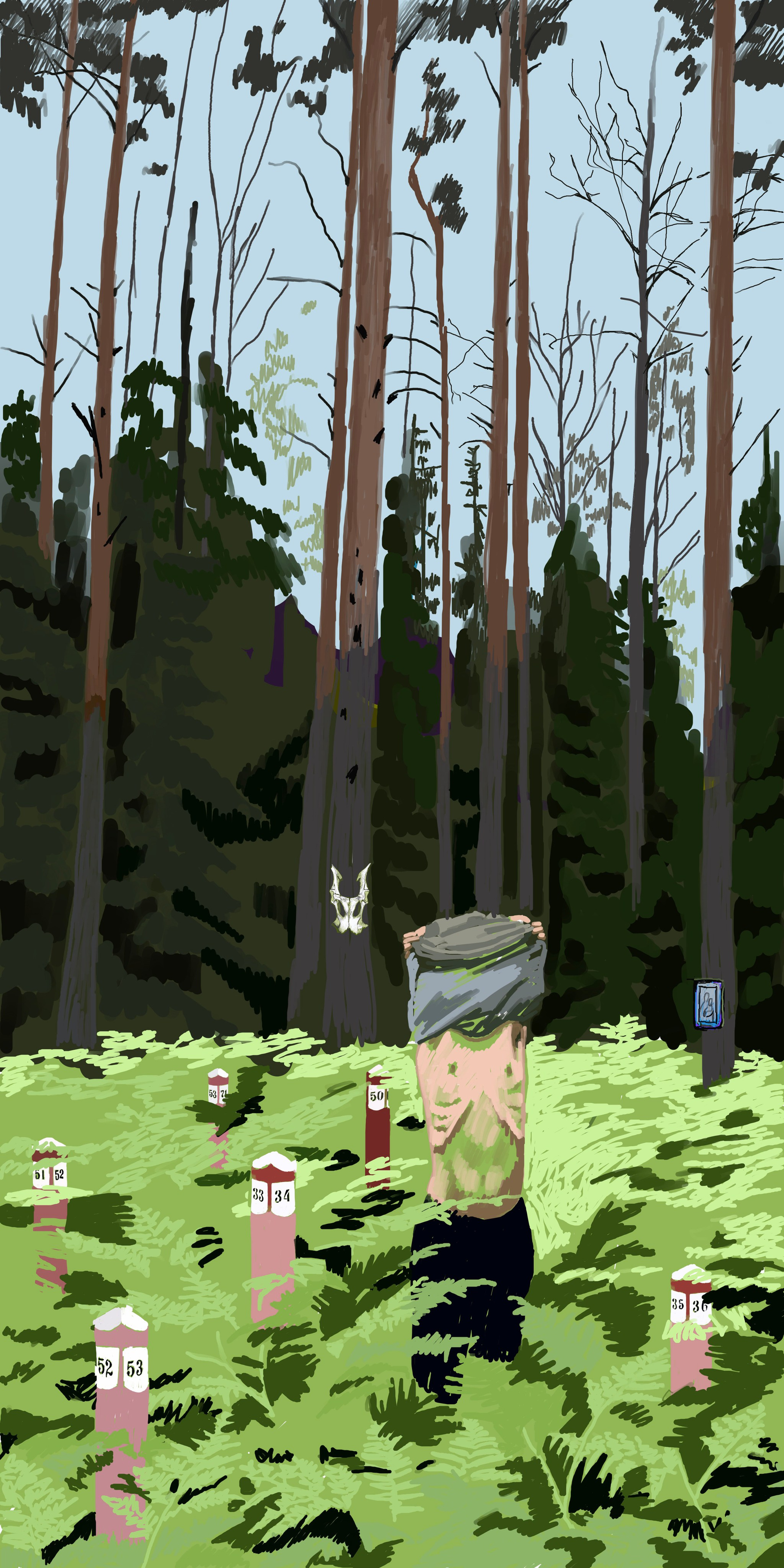 На первом маршруте, при входе в лес, меня встретила висящая на дереве икона Божьей Матери с младенцем. Сразу возникла мысль, что это символом защиты или напоминанием о духовной связи с природой. Она была выцветшего синеватого оттенка в деревянной раме. Тропа проходила по смешанному лесу, преимущественно сосна и ель. Во время маршрута лес постоянно менялся: то ландшафт был хвойным, то березовые рощи со мхом, то заросли папоротников. Так как это заповедник, на пути было много муравейников и квартальных столбов, ярких, красно-белых, будто мухоморы. Этот лес я хорошо знаю: все детство ездила в него на лесную и грибную охоту с дедушкой. Сейчас в этот лес запрещают ходить местным жителям, все сильно поменялось. Поэтому я решила пройти его по своим тропам, обходя пост охраны со шлагбаумом. Пройдя 9 км до искусственного карьера с водой, мне встретился фрагмент скелета неизвестного дикого животного. Позже выяснилось по форме, что это тазовая кость, хотя выглядела она, словно череп с рогами.